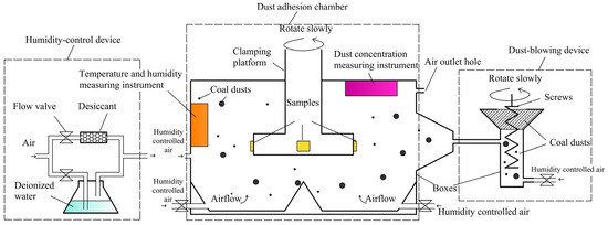 To measure the amount and size of the coal dust adhering to the test samples, a coal dust adhesion experimental platform was designed and constructed. This platform consisted of a dust-blowing device, dust adhesion chamber, and humidity control device, as shown in Figure 4. The dust-blowing device facilitated the transportation and dispersion of coal dust to achieve a specific concentration within the sealed chamber. The humidity control device regulated the RH within the chamber. The samples were made to move in uniform circular motion at low speed (12 r/min) on a loading platform (with an installation radius of 75 mm) for uniform dust adhesion and to minimize the influence of centripetal forces.