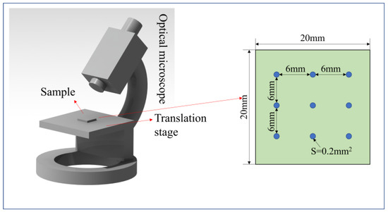 The concentration of coal dust was measured by a dust concentration tester (YRF100A, Yaorui, Jinan, China) and set at 20–100 mg/m3 to simulate the real environment of underground coal mines, where the concentration of coal dust is in the range of zero to several hundred mg/m3. RH was chosen as the primary variable and was set to be 30%, 40%, 50%, 60%, 70%, and 80% during the experiments. The experiments were also performed at room temperature and near-standard atmospheric pressure. Three samples were used in each experiment. After the adhesion, the experimental fused silica samples were observed under an optical microscope (BA310Met, Motic, Xiamen, China) at 9 positions for capturing the images, each with a field of view of 0.2 mm2, as shown in Figure 5. Image processing software (OLYCIA m3) was used to count the particles within the 9 fields of view. During the image processing, the equivalent circular area diameter was used for the particles with irregular shape, which can be expressed below: