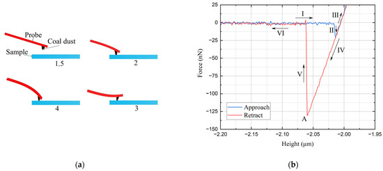 As previously mentioned, the adhesion force of the particles mainly includes van der Waals forces (), electrostatic forces (), and capillary forces (). The van der Waals and capillary forces are usually observed in the nanometer range [37]. Electrostatic forces act over longer distances at the micron level and are generally stronger than the van der Waals and capillary forces [9,16]. It is seen from Figure 6b that segments I and VI of the force curve did not undergo a large deflection, which signifies that the probe was not remotely attracted to the fused silica glass even at close proximity. The action distance did not reach the micron level; therefore, electrostatic forces were not present. Thus, it was concluded that the adhesion force between the coal dust particles and fused silica surface mainly originates from van der Waals and capillary forces.