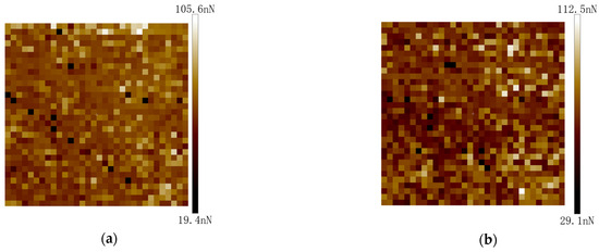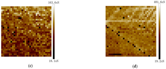 Based on the above process, the adhesion forces between the individual coal dust particles and fused silica glass samples were measured, and the results are presented in Figure 7, Figure 8 and Figure 9. Figure 7 shows the adhesion force map of the Tip1 probe on the fused silica surface. To maximally eliminate the influence of roughness of the contact surface and other uncertainties on the experimental results, adhesion forces on a 32 × 32 pixel-sized area with dimensions of 90 μm × 90 μm were measured. In all, 1024 force curves and their corresponding force values were obtained. Images of the adhesion forces corresponding to the 32 × 32 pixel-sized area at different RH values are presented in Figure 7. The colored shades reflect the magnitudes of the adhesion force. As seen in Figure 7, the adhesion force is not the same at different acquisition points.