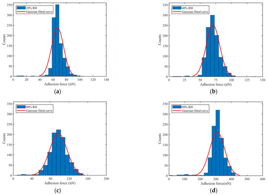 The adhesion forces at all the points were recorded and are displayed in the histogram shown in Figure 8. It is seen that the adhesion forces at different points exhibit a Gaussian distribution. The mean value (μ) of the Gaussian fitted curve gradually shifts to the right with increasing RH, indicating that the adhesion force increases with RH.