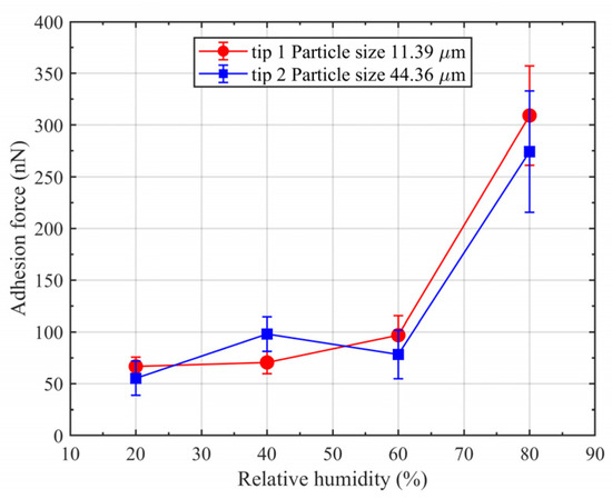 RH plays a vital role in determining the underlying mechanism of the adhesion force [20]. The extent of water adsorption on the particles is directly governed by the RH of the surrounding atmosphere. It is generally recognized that the adhesion force is principally the van der Waals force at low RH values, whereas the capillary force is predominant at higher RH due to capillary condensation and the formation of liquid bridges [9,21]. However, numerous conflicting results in the available literature indicate that the variation rule of the adhesion force with respect to RH is inconsistent [22]. It was observed that the geometry (size, shape, roughness, and tilt angle) and surface properties of the particles had a combined effect with RH on particle adhesion [23,24,25,26].