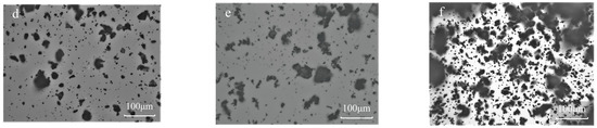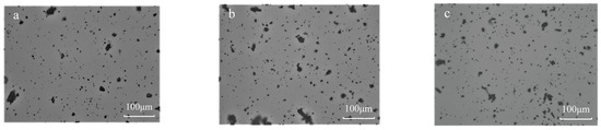 Based on the study of the adhesion force between individual coal dust particles and fused silica, the adhesion of bulk coal dust to the surface of fused silica was investigated. A coal dust adhesion test was conducted using the experimental platform shown in Figure 4, and the status of the coal dust adhered to the surface of fused silica glass was observed using an optical microscope. Figure 11a–f show the optical microscope images of coal dust adhered to the surface of fused silica samples at different RH levels of 30%, 40%, 50%, 60%, 70%, and 80%, respectively, with the concentration of coal dust in the range of 20–100 mg/m3. It is observed that the density of coal dust adhering to the fused silica sample gradually increased with the increase in RH. Comparing Figure 11d–f with Figure 11a–c, it is inferred that larger-sized coal dust particles adhered to the surface of the fused silica glass more easily at higher RH. The total amount of coal dust that adhered to the fused silica surface and the number of large-sized particles reached a maximum when the humidity was 80%.