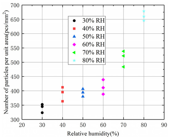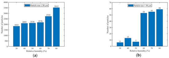 The particle size distribution of coal dust attached to the fused silica glass surface under different humidity conditions is shown in Figure 13. Figure 13a,b illustrate the relationship between RH and the quantity of coal dust particles of sizes smaller than 50 (referred to as small particle size) and larger than 50 (referred to as large particle size), respectively. It is clearly seen that the number of small-sized coal dust particles adhering to the fused silica surface is much larger than that of large-sized particles at all levels of humidity. Figure 13b also indicates a significant increase in the quantity of large-sized particles at a RH greater than 60%. The number of large-sized particles adhering to the fused silica surface at RHs of 60%, 70%, and 80% was approximately 10 times higher as compared to that at RHs of 30%, 40%, and 50%. These findings suggest that increased RH promotes an increase in the quantity of large-sized coal dust particles adhering to the fused silica surface. This is attributed to the enhanced attractive forces between the coal dust particles and fused silica in environments of high humidity.