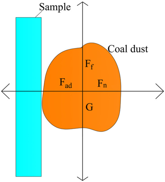 As shown in Figure 9, the adhesion between coal dust particles and fused silica increases with humidity. It is seen from Equation (6) that an increase in adhesion leads to an increase in the frictional force between the particles and fused silica glass, which further leads to the increased adhesion of large-sized particles. This explains the reason for the significant increase in the adherence of large-sized coal dust particles when the RH exceeds 60%.