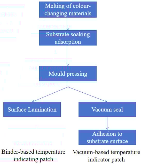 This research delineates the fabrication of two variants of oscillometric patches, binder-type and vacuum-based, with the preparation process shown in Figure 1. Initially, a specified quantity of the previously synthesized color-changing powder was heated until molten in a beaker. A cellulose–polyester blend fabric, serving as the adsorption substrate, was then thoroughly saturated in the molten mixture, subsequently extracted, and placed into custom pressing molds. For the binder-type oscillometric patches, a uniform layer of binder was applied to one side of a PET film, which, upon pressure molding, ensured a secure adhesion to the aluminum substrate plate. This process eliminated air pockets, resulting in the formation of binder-type temperature-responsive patch samples. Conversely, the vacuum-based patches were produced by enclosing the cooled and pressed material within a high-temperature sealing bag and subjecting it to vacuum sealing. A binder was then applied to facilitate adherence to the aluminum substrate plate, culminating in the creation of vacuum-based temperature-responsive patch samples. These samples were specifically designed for the detection of thermal anomalies in the bushing columns of transformers.
