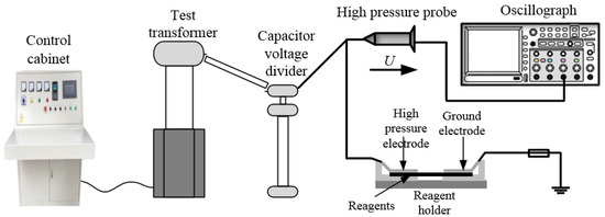 (2) Insulation performance analysis: Insulation integrity was assessed utilizing the surface flashover test principle, as depicted in Figure 2. The test circuit consisted of a console, protection resistor, test transformer, and capacitor divider. The oscilloscope was connected to a high-voltage probe to detect the output voltage in real time. This examination was conducted under controlled environmental conditions, maintained at (25 ± 1) °C. Adhering to the standards outlined in GB/T 1408.1-2016 [25], a gradual-voltage-increase test was employed, with a voltage ramp rate meticulously set to 0.5 kV/s. This method ensures a comprehensive evaluation of the insulation’s performance under electrical stress.