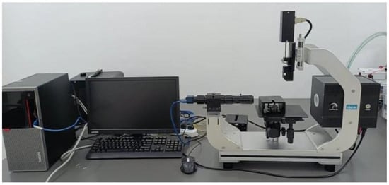 (3) Water contact angle test: The water contact angle test platform is shown in Figure 3. The temperature indicator patch sample to be measured was placed on the sample table of the water contact angle measuring instrument, the position of the sample was adjusted so that the acquisition system could obtain a clear image, and the injection unit was triggered to make the liquid drop fall on the surface of the sample. The water contact angle data were obtained by using the automatic ellipse fitting method. Ten locations were measured for each group of samples, and the average water contact angle was obtained after removing the maximum and minimum values.