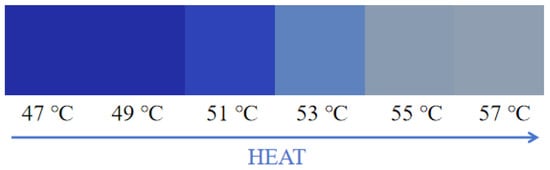 (1) Discoloration temperature: The experiment commenced with the placement of the temperature-sensitive patch, adhered to a substrate, on a precision-controlled heating platform. The platform’s initial temperature was meticulously set to 30 °C. Employing a graduated heating approach, the temperature was incrementally increased by 1 °C every three minutes. Throughout this process, the chromatic transition of the patch was systematically documented, establishing a detailed profile of its temperature responsiveness.