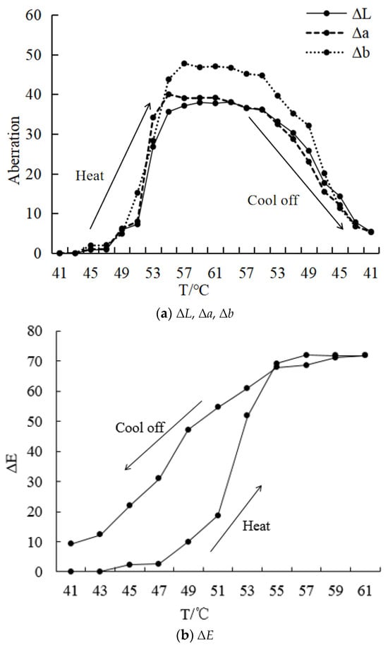 Figure 5 illustrates the variation in the color difference (ΔE) of the reversible temperature-indicating patch across different thermal conditions, employing ΔE as a metric to delineate the fading-color range. A significant shift in ΔE from its baseline at a specific temperature denotes the onset of color transformation. As can be seen from Figure 5a, the color difference values of the brightness index difference ΔL, red and green axis color index difference Δa, and yellow and blue axis color index difference Δb increase with the increase in temperature, and the value changes little before 49 °C, when the corresponding patch color does not fade significantly. When the heating temperature reaches 49 °C, the change rates of ΔL, Δa, and Δb increase significantly, and the surface color of the patch gradually disappears. When the temperature reaches 55 °C, ΔL, Δa, and Δb tend to be stable. After cooling, ΔL, Δa, and Δb continue to decrease, but their rate of decrease is slower than that of heating up. It can be seen from Figure 5b that the variation trend in the color difference ΔE is basically consistent with that of ΔL, Δa, and Δb, and there are obvious differences in the heating and cooling processes, indicating that the patch has a thermal hysteresis effect in the cooling process.