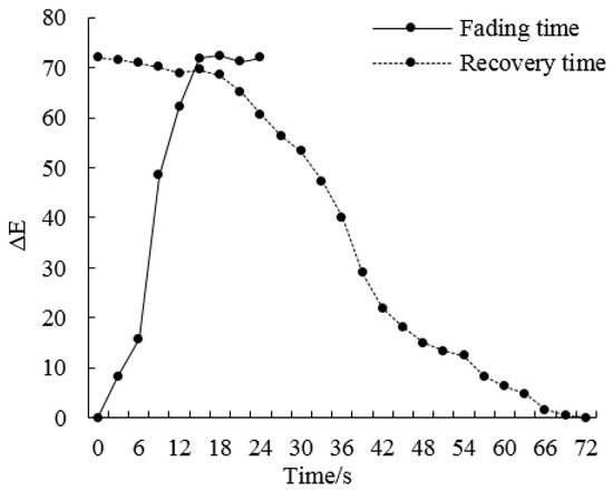 The sensitivity of color change of the temperature-indicating patch is an indicator of its responsiveness to external thermal stimuli; it is quantified by two key metrics: fading time and recovery time. These durations inversely correlate with color sensitivity: shorter fading and recovery periods signify a heightened sensitivity, denoting a quicker response to thermal changes. The test samples were heated at 70 °C and cooled at 25 °C, and the color difference ΔE changed with time to determine the color change time. Figure 6 delineates the temporal dynamics of color transformation for the reversible temperature-indicating patch, illustrating its efficiency in reacting to thermal variations.