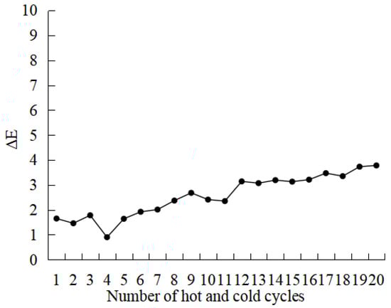 The reversible temperature indicator patch was subjected to cold- and hot-cycle tests at 25 °C and 70 °C. In order to ensure the complete discoloration of fading/recoloring, it was left for 3 min at each temperature. Figure 7 presents the variation in color difference (ΔE) of a reversible temperature-indicating patch subjected to 20 thermal cycles.