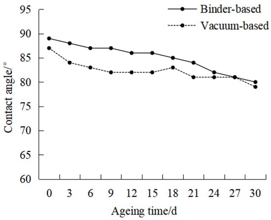 Figure 8 presents the variation in water contact angle for binder-based and vacuum-based temperature-sensitive patches subjected to thermal aging at 80 °C. As the aging duration increases, a consistent decrease in the water contact angles of both patch types is observed. Specifically, the water contact angle for the binder-based patch diminishes from 89° to 80°, whereas for the vacuum-based patch it declines from 87° to 79°. Initially, the binder-based patch exhibits a higher water contact angle compared to the vacuum-based patch, indicating differences in their surface hydrophilicity due to their material compositions and structural characteristics. The reasons are as follows:
