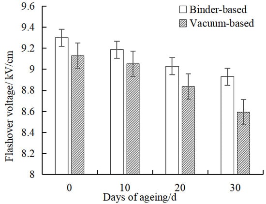 Figure 9 demonstrates the effect of thermal aging duration on the flashover voltage per unit length across the surface of thermal patches. Compared to vacuum-based thermal patches, those of the adhesive type exhibit superior flashover voltage performance per unit length. As the aging period extends, a downward trend in flashover voltage per unit length is observed for both adhesive and vacuum types. After a 30-day aging period, the flashover voltage per unit length for adhesive-type thermal patches declines from 9.30 kV/cm to 8.93 kV/cm, a 3.98% decrease, while for vacuum-based, it reduces from 9.13 kV/cm to 8.59 kV/cm, representing a 5.91% decrease. The electrical performance of an adhesive temperature indicator patch is more stable than that of a vacuum-based. These results can be explained by the following reasons: