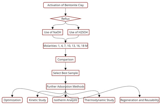 While existing literature predominantly focuses on the activation of BC using high concentrations of sulfuric acid (H2SO4) [16,17,18,19] and hydrochloric acid (HCl) [20,21], processes that have been shown to enhance the clay’s surface area and porosity. The exploration of sodium hydroxide (NaOH) activation through the reflux method for MB removal represents a relatively uncharted research avenue. This novel approach harbors the potential to enhance the adsorption properties and surface reactivity of BC and develop mesoporous structures conducive to improved adsorptive efficiency. Furthermore, NaOH is positioned as an environmentally friendlier alternative to other chemical activators, such as KOH, owing to its reduced corrosivity and associated hazards [22,23,24].