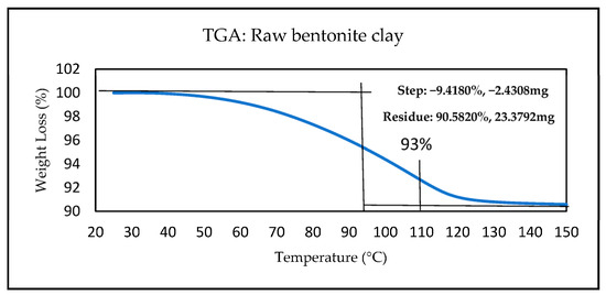 Thermogravimetric analysis (TGA) was performed on the raw BC sample to assess its thermal stability and composition. The investigation extensively explored the thermal behavior of the clay across a temperature range of 25–150 °C, as depicted in Figure 3.