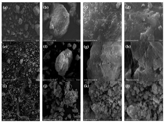 SEM images depicting the effect of activation dosage on the morphology of BC. (a–d): corresponding to raw BC; (e–h): corresponding to 7 M of AABC; (i–l): corresponding to 16 M of BABC at varying scales (200 µm; 50 µm; 10 µm; 3 µm, respectively).
