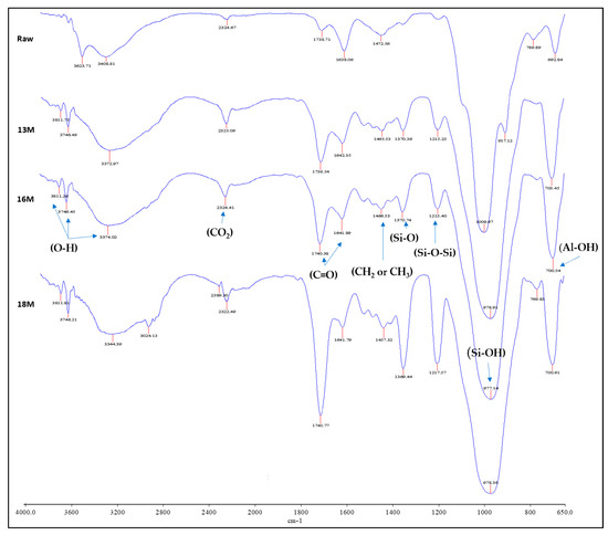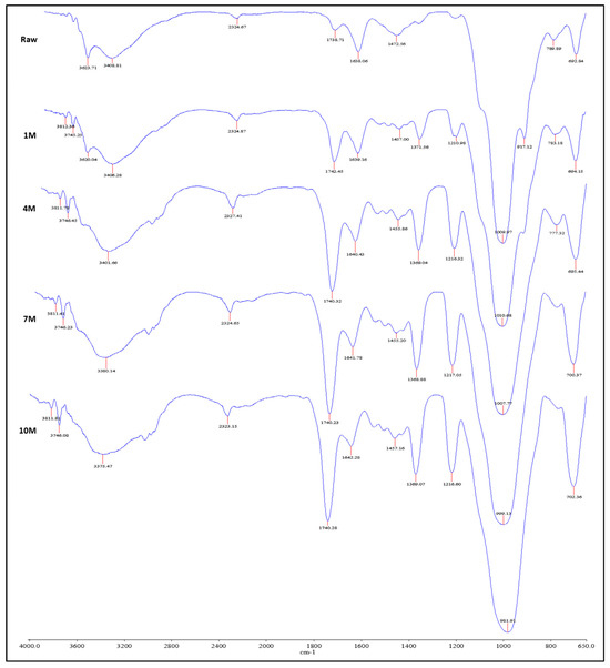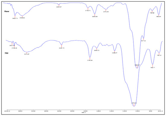 FTIR analysis (650–4000 nm) was conducted on BABC samples activated with various dosages of (1 M, 4 M, 7 M, 10 M, 13 M, 16 M, and 18 M) shown in Figure 5 and Figure 6, and AABC of the optimal activation dosage of (7 M) presented in Figure 7, to investigate changes in functional groups and assess the impact of activation dosage. The raw clay exhibited peaks at 3623.71 cm−1, 3408.81 cm−1, and 2324.67 cm−1, indicating the presence of hydroxyl groups, water molecules, and adsorbed CO2. Peaks at 1738.71 cm−1, 1638.06 cm−1, and 1472.56 cm−1 suggested the presence of carbonyl groups and organic compounds, while peaks at 1009.97 cm−1, 917.12 cm−1 and 789.89 cm−1 indicated the presence of Si-O bonds, Si-O-Si bonds, and Si-O-Al bonds, respectively. The peak at 692.84 cm−1 suggested the presence of Si-O-Mg bonds. Activation with (NaOH) BABC resulted in variations in the peaks associated with hydroxyl groups, water molecules, carbonyl groups, Si-O stretching vibrations, and bending vibrations of Al-OH groups [45,46,47]. Activation with (H2SO4) AABC showed peaks related to hydroxyl groups, water molecules, carbonyl groups, Si-O bending and stretching vibrations, as well as stretching vibrations of Si-O bonds and Si-O-Si bonds [17,46]. Figure 5 and Figure 6 illustrate the FTIR characterization analysis of raw BC and BABC activated by (1–18 M).