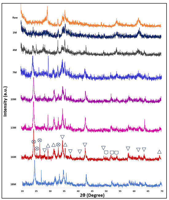 XRD analysis of raw BC and activation (1–18 M) of BABC, (Na2O (⊗), SiO2 (△), Al2O3 (▽), MgO (⛉)).
