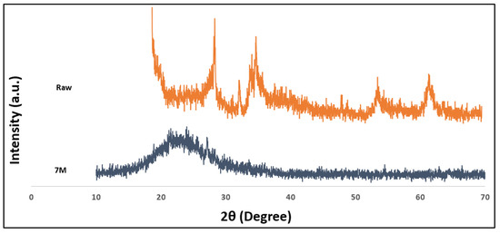 In contrast, the X-ray diffraction pattern of the optimal activation of AABC (7 M), shown in Figure 9, exhibited distinct peaks at around 23° (intensity 122, SiO2) and 27.1° (intensity 100, Al2O3), attributed to silicon dioxide and aluminum oxide, respectively, aligning with previous findings [46]. Based on the XRD analysis, the 16 M activation condition displayed superior intensities of relevant compounds compared to all BABC and AABC activation dosages, suggesting its enhanced suitability for MB adsorption. This condition is anticipated to offer a higher adsorption capacity for MB than other activation conditions.