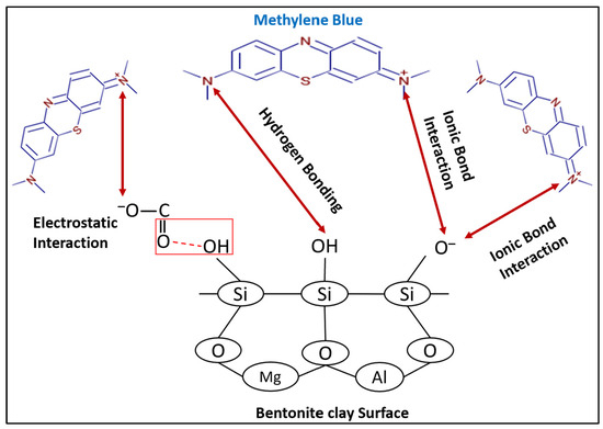 Bentonite clay (BC), recognized for its abundant availability, cost-effectiveness, and remarkable adsorption capacity, has attracted considerable attention as a potential adsorbent for dye remediation [11,12]. Previous studies have highlighted the effectiveness of BC in adsorption and separation, emphasizing its high cation exchange capacity, stability, and strong adsorption capabilities [13,14]. Nonetheless, the realization of BC’s full adsorptive potential typically necessitates chemical modifications aimed at augmenting its surface area and the availability of adsorption sites, thereby significantly boosting its performance in dye removal applications [15].