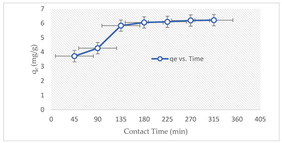 The adsorption process was conducted to determine the optimal contact time for removing MB using BC. The experiments were carried out at a constant temperature of 25 °C, pH 7, with a dosage of 0.8 g and an initial concentration of 50 ppm. The contact time was varied from 45 to 315 min, with measurements taken every 45 min using shaker equipment operating at 135 rpm using a shaker (KS 4000 I control (IKA)—Werke GmbH & Co. KG, Staufen, Germany). Figure 11 depicts the optimization investigation, showing changes in contact time and visually representing adsorption capacity (qe) over time.