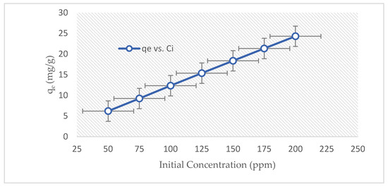 The influence of initial concentration (ranging from 75 to 200 ppm) on adsorption was explored under conditions of 25 °C, 0.8 g dosage, 270 min contact time, and pH 7. The most favorable outcome emerged at 200 ppm among the various concentrations tested. This concentration yielded a notable result, leading to a considerable reduction in MB’s final concentration to 5.652 ppm, showcasing an impressive removal efficiency of 97.173%. The adsorption capacity also reached a remarkable value of 24.293 mg/g. In a similar context, a 95% MB removal rate within 300 min (equivalent to 5 h) was accomplished, utilizing parameters including 200 ppm (mg/L) initial concentration, 1.5 g dosage, pH8, and 30 °C within a 50 mL solution [57]. Moreover, the adsorption of MB onto Na-bentonite clay was delved into. Their study underscored the notable impact of initial concentration on MB’s adsorption onto Na-bentonite, revealing an observable rise in adsorption capacity with increasing initial concentration [60].