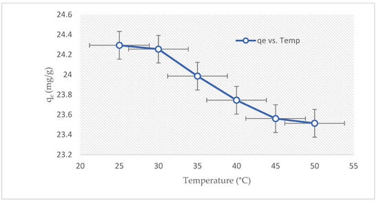 The impact of temperature (ranging from 25 to 55 °C) on adsorption was investigated under consistent conditions involving a 0.8 g dosage, pH 7, 200 ppm initial concentration, and 270 min of contact time. Surprisingly, the most favorable outcomes were observed at the lowest tested temperature, 25 °C, aligning with findings from prior research [61,62]. Notably, at this temperature, the final concentration of MB was diminished to 5.652 ppm, signifying a robust removal efficiency of 97.173% and an adsorption capacity of 24.293 mg/g. Additionally, a temperature range of 20 °C to 50 °C was explored, revealing that the removal efficiency escalated as the temperature increased from 20 to 30 °C. Specifically, at 30 °C, the removal percentage reached 95% after 200 min, while achieving a similar removal efficiency necessitated 300 min at 20 °C [57]. Conversely, the removal rate of MB showed marginal improvement at 40 °C and 50 °C when compared to the performance at 30 °C. Correspondingly, temperature ranges of 25 °C to 45 °C were investigated, and it was ascertained that the optimal outcomes were observed at 25 °C [59].