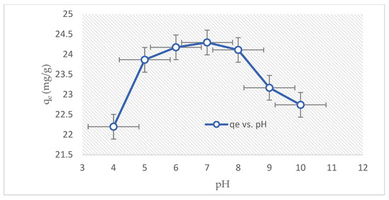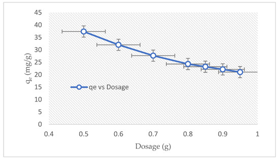 In this section, optimization studies were conducted for batch experimentation to improve ABC adsorption capacity (q) for the removal of MB. Various parameters, such as contact time (0–315 min), initial concentration (50–200 ppm), temperature (25–50 °C), pH (4–10), and dosage (0.5–0.95 g), were systematically investigated to assess their impact on adsorption efficiency. The adsorption capacity (q), a critical metric quantifying the maximum adsorbate binding per unit mass or volume on the adsorbent, was determined using the formula presented in Equation (1) [32,33,34]: