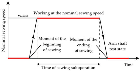 W. Oeser is one of the first authors in the field of clothing technologies to present a diagram of the nominal sewing speed as a function of time with the acceleration and deceleration phases of the arm shaft (Figure 1), but without investigating the influence of the worker [6]. F. Krowatschek and P. Ludemann [7] carried out extensive measurements of the mechanical and dynamic properties of sewing machines.