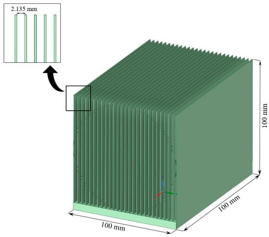 For validation with [45], we built a 3D model of the heat sink described in [45], and then calculated the thermal resistance and pressure drop using our calculation model. The dimensions of the heat sink were set to the same dimensions as in [45]. At the same time, we retained our parameters of the computational domain described in Figure 2a. This is done in order to demonstrate how the calculation results are affected by the computational domain size. Figure 7 shows an image of the 3D model of the heat sink we built, as described in [45].