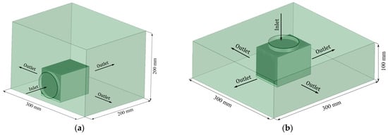The problem of air flow around a heated plate-fin heat sink has been resolved. We built 3D models of square-section heat sinks with different numbers of plate fins (27, 39, and 43). Figure 1 shows a 3D model of a heat sink with 27 fins (model N27). Figure 2 presents pictures of the calculation areas using the example of the N27 heat sink for two variants of the fan position: from the side (a) and from the top (b). Depending on the position of the fan, either horizontal (fan on the side) or vertical (fan on the top) airflow of the heat sink was carried out. The dimensions of the N27 model are 100 × 100 × 100 mm, and the dimensions of the calculation area for this model with horizontal airflow are 300 × 200 × 200 mm, while with vertical airflow they are 300 × 300 × 100 mm. The dimensions of the N39 heat sink model with 39 fins are 69.9 × 69.9 × 69.9 mm, and the dimensions of the calculation area for this model with horizontal airflow are 269.9 × 169.9 × 169.9 mm, while with vertical airflow they are 269.9 × 269.9 × 69.9 mm. The dimensions of the N43 heat sink model with 43 fins are 69.4 × 69.4 × 69.4 mm, and the dimensions of the calculation area for this model with horizontal airflow are 269.4 × 169.4 × 169.4 mm, while with vertical airflow they are 269.4 × 269.4 × 69.4 mm. Further detailed characteristics of heat sink models are shown in Table 1.
