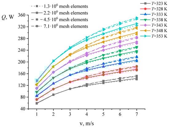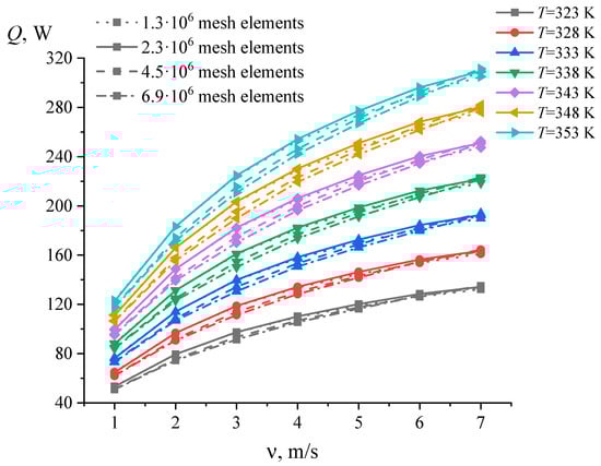 The mesh division is checked by refining the computational mesh, during which there is no further change in the calculated parameters, or they change with minimal error. We present the results of a mesh division check on the N39 heat sink. The results of heat flow calculation for the N39 heat sink are shown in Figure 3, which shows meshes with 1.3 million, 2.2 million, 4.5 million, and 7.1 million elements with horizontal airflow. The results of calculating the heat flow for N39 with vertical airflow are presented in Figure 4. In this case, we studied the meshes with the following number of elements: 1.3 million, 2.3 million, 4.5 million, and 6.9 million. In the graphs, the solid lines indicate the results for meshes with 1.3 million elements for the cases of horizontal and vertical airflow; the dotted lines represent the results for meshes with 2.2 million elements for horizontal airflow, and 2.3 million elements for vertical airflow; the dots indicate results for meshes with 4.5 million elements for the cases of horizontal and vertical airflow; and the dashed-dotted lines show the results for meshes with 7.1 million elements for horizontal airflow, and 6.9 million elements for vertical airflow.