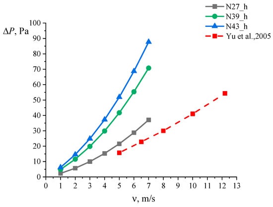 Verification of calculations with the study of Yu et al. [45]: graphs of changes in pressure drop depending on air velocity. Solid lines indicate the results of our calculations; dotted lines indicate the results of Yu et al.