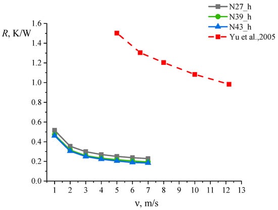 Figure 6 shows graphs of changes in thermal resistance depending on air velocity. Yu et al. [45] conducted studies of thermal resistance at an air temperature of 294 K, a heat sink base temperature of 333 K, and an air velocity of 5 to 12.2 m/s. The results of our research are presented for the case of horizontal blowing at an air temperature of 293 K, a heater temperature of 333 K, and air velocities from 1 to 7 m/s. Thus, thermal resistance studies were carried out by us and Yu et al. at close values of air and heater temperatures and air velocity. It is necessary to note the similarity between the thermal resistance curves obtained in our work and that of Yu et al. [45]. As we can see, the heat sink models we studied have lower thermal resistance values than the heat sink models studied in [45]. The heat sink in [45] has a thermal resistance of 1.5 K/W at a 5 m/s air velocity. The thermal resistance of heat sinks N27, N39, and N43 is 0.25, 0.22, and 0.02 K/W, respectively. The thermal resistance of the heat sink in [45] exceeds that of heat sink N27 by 6 times, heat sink N39 by 6.8 times, and heat sink N43 by 7.5 times. These differences are explained by the fact that the heat sinks N27, N39, and N43 have a significantly higher number of fins (27, 39, and 43) than the heat sink in [45], which has 9 fins. Furthermore, the heat sink in [45] has smaller dimensions than our heat sinks N27, N39, and N43. Accordingly, the surface area of the heat sink in [45] is significantly smaller, which explains the high thermal resistance values.