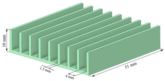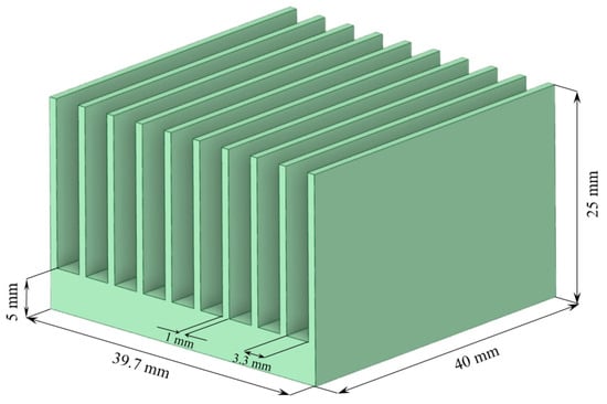Furthermore, the numerical calculations were verified by comparing the results with the work of Freegah et al. [46]. For this purpose, a 3D model of a plate-fin heat sink was built (Figure 9), maintaining the dimensions specified in [46]: length 40 mm, width 39.7 mm, height 25 mm, number of fins N = 10, fin thickness 1 mm, and distance between fins 3.3 mm. We also retained the computational domain parameters described in Figure 2a. The heater temperature (323–353 K), air mass flow rate (from 1 × 10−3 to 4 × 10−3 kg/s), and air temperature (293 K) were set at the boundary of the computational domain. The range of the air mass flow rate was established based on the findings of the study [46]. The temperature range investigated in our study (323–353 K) and that of Freegah et al. (328–355 K) share similar values. Thus, we retained our temperature range (323–353 K) in the calculations.