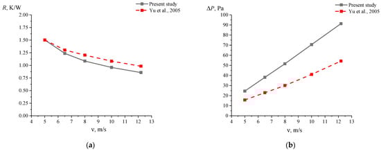 The calculation was conducted for the case of horizontal airflow, and the same values of air temperature (294 K), air velocity (5, 6.5, 8, 10, and 12.2 m/s), and heater temperature (333 K) were specified within the boundaries of the calculation area, as per the work [45]. Our findings regarding the calculation of thermal resistance and pressure drop were compared with the findings obtained in [45]. Figure 8 shows graphs of thermal resistance (a) and pressure drop (b) depending on air velocity. We can see from the graphs that the thermal resistance curves are similar in nature, and the differences in values range from 0.035% to 12.86% depending on the air velocity. The differences in the values are explained by the differences in the computational domains used in our work and in [45]. In [45], gas flow is considered only in the region limited by the heat sink. In our study, there is also an external problem, as a result of which the hydrodynamics change, which affects the change in pressure drop and heat transfer.