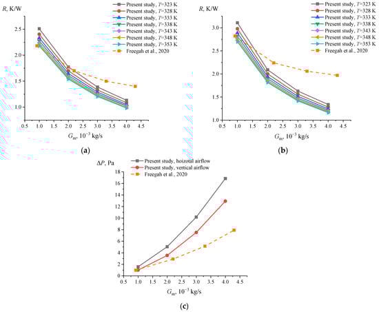 Graphs of changes in thermal resistance (a,b) and pressure drop (c) depending on the air mass flow. The results obtained in our calculations are represented by solid lines; the results of Freegah et al. [46] are represented by dotted lines. Figure (a) presents the results for the case of horizontal airflow, and the results for the case of vertical airflow are presented in Figure (b).