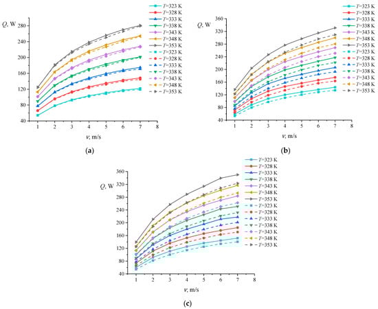 Graphs of changes in heat flow depending on air velocity for different temperature values (323–353 K) for the heat sink models studied: (a) N27; (b) N39; (c) N43. Solid lines show the results for the case of horizontal airflow, and dotted lines show the results for the case of vertical airflow.