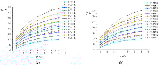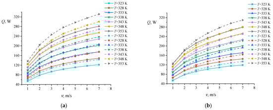 Graphs of changes in heat flow depending on air velocity for different temperature values (323–353 K) for models N27 (solid lines) and N39 (dashed lines) with (a) horizontal and (b) vertical airflow.