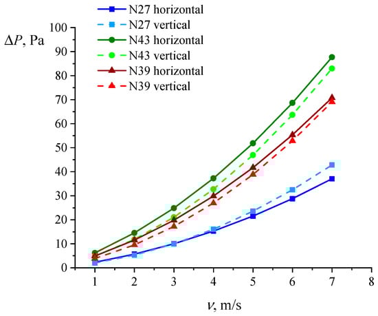 In order to assess the influence of the blowing direction and heat sink geometry on hydrodynamics, we carried out pressure drop calculations. The results are presented in Figure 14. From the graphs, we can see that at air velocities from 1 to 3 m/s, a lower pressure drop occurs with vertical airflow. This is true for all the heat sink models studied. At higher air velocity values in models N39 and N43, a lower pressure drop is still observed with vertical airflow, and in model N27, a lower pressure drop is observed with horizontal airflow. The highest pressure drop is observed in the N43 heat sink and is 87.71 Pa with vertical airflow at an air velocity of 7 m/s. N27 has the lowest pressure drop of 37.07 Pa at ν = 7 m/s. With a fixed volume of metal (models N27 and N43), the pressure drop is higher in N43 by 136.61% with horizontal airflow and by 93.80% with vertical airflow (ν = 7 m/s). With a fixed surface area (models N27 and N39), the pressure drop is higher in N39 by 90.94% with horizontal airflow and by 61.29% with vertical airflow (ν = 7 m/s). Models N39 and N43 have a smaller distance between the fins and, accordingly, have greater resistance to air flow. This explains why the pressure drop in these models is higher than in the basic model N27.