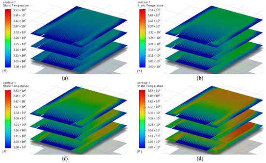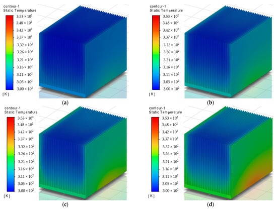 The temperature fields of the heat sink model N27 for the case of horizontal airflow at a fixed air velocity of 4 m/s and varying heater temperatures T are as follows: (a) 323 K, (b) 333 K, (c) 343 K, and (d) 353 K.