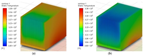 Another direction of research for optimizing heat sink design is the arrangement of fins with a slope [30]. Zhang et al. [31] proposed a heat sink design with W-type plate fins and studied the influence of the angle of inclination of the plates (30–120°), their height (35–55 mm), and the distance between them (6–14 mm) on the surface temperature of the plates. The research results indicated that there were optimal parameters for the plates at which the lowest temperature was achieved, such as the angle of inclination of the plates (45–90°) and the distance between them (8.8 and 10 mm). The rise in the fin’s height resulted in a decrease in the surface temperature.