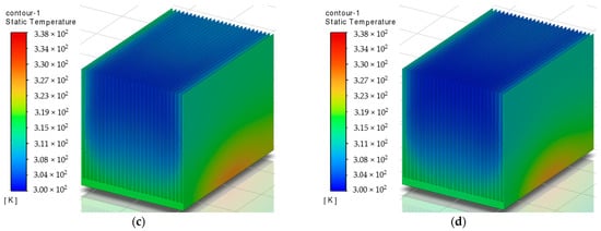 Figure 16 shows the temperature fields of heat sink model N27 for horizontal airflow with a fixed heater temperature of 338 K and air velocity of 1, 3, 5, and 7 m/s. The temperature field of the heat sink changes significantly, and as the air velocity increases, the heat sink cools more efficiently.