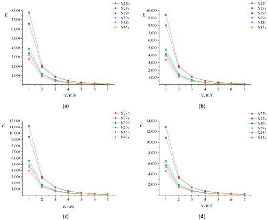 It should be noted that at air velocities of 1 and 2 m/s, the N27 heat sink demonstrates greater efficiency values with vertical airflow. The difference is 18.74% and 7.12%, respectively, at T = 353 K. At high air velocities (from 3 to 7 m/s), horizontal airflow is 0.73–16.21% more effective at T = 353 K. For N39 and N43 heat sinks, vertical airflow is more effective in the range of air velocities from 1 to 5 m/s. At T = 353 K, the values of E with vertical blowing of heat sinks N39 and N43 are 14.04–0.27% and 14.98–1.24% higher, respectively, than with horizontal blowing. These values decrease with increasing air velocity. At higher air velocities (6 and 7 m/s), the E values are higher with horizontal airflow by 1.61% and 4.39%, respectively, for the N39 heat sink, and by 1.87% and 2.43% for the N43 heat sink, at T = 353 K.