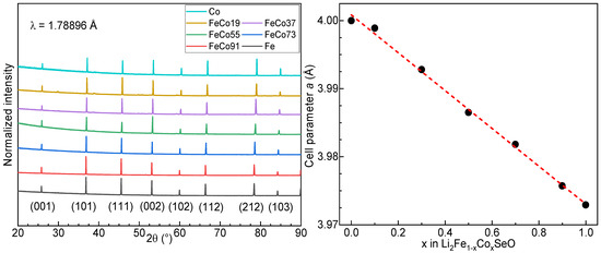 (Left) Powder X-ray diffractograms of the synthesized Li2Fe1−xCoxSeO compounds (S. G. Pm−3m). “Fe” and “Co” in the labels correspond to Li2FeSeO and Li2CoSeO, respectively, and the abbreviation “FeCoXY” reflects the ratios of 3d metals. (Right) Linear change of the cell parameter (shown by black points) in dependence on the 3d metals ratio.