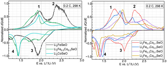 Normalized differential capacity plots for: (Left) the end members of the Li2Fe1−xCoxSeO row and Li2Fe0.5Co0.5SeO; (Right) the materials with unequal amounts of Fe and Co in the structure. Numbers 1–4 reflect the electrochemical processes discussed in the text.