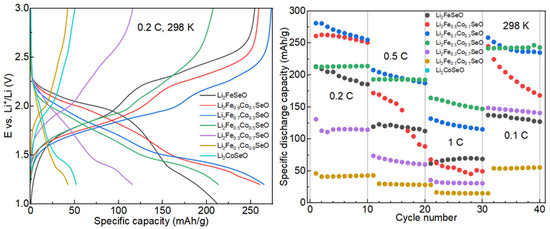 (Left) typical galvanostatic charge–discharge curves for Li2Fe1−xCoxSeO solid solutions; (Right) results of their rate-capability tests. Note that for Li2FeSeO, the lower potential cut-off was moved to 1.0 V vs. Li+/Li as an attempt to increase its Coulombic efficiency towards 100%.