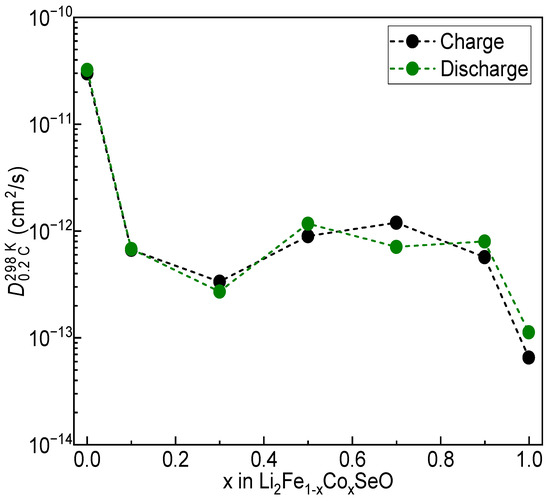Diffusion coefficient vs. chemical composition for Li2Fe1−xCoxSeO solid solutions at 298 K.