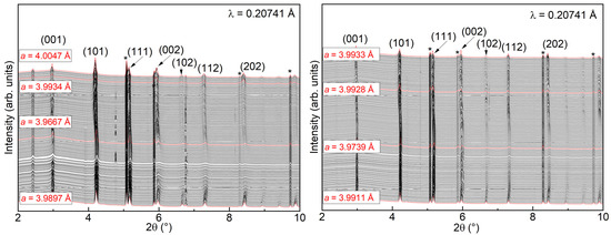 The preparation of the electrodes was realized in the same manner, but the Al-mesh with a bigger cell was used, so its contribution to the obtained diffraction patterns was minimized. Electrochemical cells were of coin-type 2032, with custom-made glass windows, allowing the beam through. The cells were put into an 8-fold rotating sample holder, connected to a VMP3 potentiostat (Biologic Instruments, France) [25]. Electrochemical cycling was performed at a 0.1 C current density, and one XRD pattern was obtained within 10 min, including all the necessary adjustments. The 2θ range was 0–23 degrees. A Le Bail and Rietveld [26] analysis of the obtained data was performed using Jana2006.